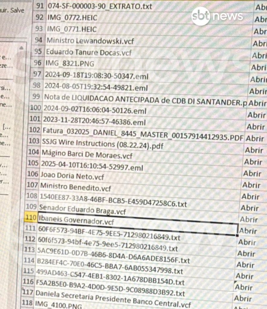 A lista inclui ainda os números de três ministros do Supremo Tribunal Federal: Dias Toffoli, Alexandre de Moraes e Nunes Marques. Também constam o telefone do ex-ministro Ricardo Lewandowski e de seu filho Henrique, além de ministros do Superior Tribunal de Justiça, como Benedito Gonçalves. Governadores do Distrito Federal, Ibaneis Rocha, e do Rio de Janeiro, Cláudio Castro, igualmente figuram entre os contatos.