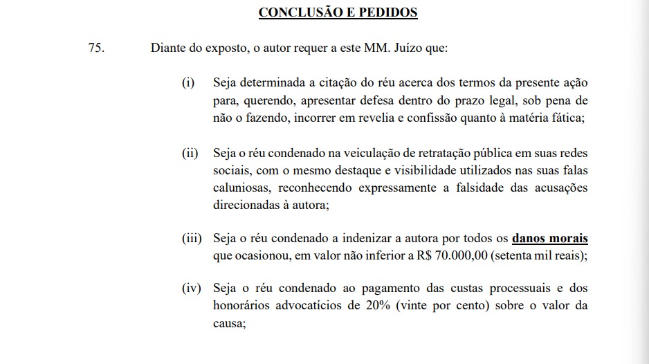 Os advogados Gustavo Mizhahi, Felipe V. Rei, Yuri Paesleme e Thayná Costa, representantes da artista, pedem uma indenização de R$ 70 mil e uma retratação pública, sob pena de multa diária em caso de descumprimento. O processo inclui prints de redes sociais que demonstram a repercussão negativa das acusações.