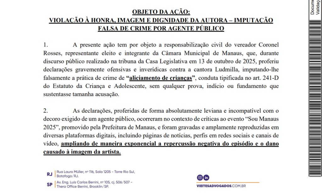 A cantora Ludmilla moveu uma ação de indenização por danos morais contra o vereador de Manaus Ubirajara Rosses do Nascimento Júnior, conhecido como Coronel Rosses. O processo se baseia em declarações feitas pelo parlamentar na tribuna da Câmara Municipal de Manaus (CMM) em 13 de setembro de 2025, nas quais ele acusou a artista de “aliciar crianças” durante o festival “Sou Manaus – Passo a Paço 2025”.